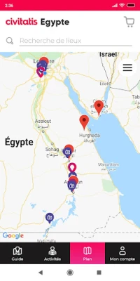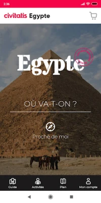 Naviguez aisément grâce à une carte interactive et détaillée, visualisant d'un coup d'œil les incontournables, les restaurants à ne pas manquer, les quartiers d'hébergement idéaux et les zones d'activités. Pour enrichir encore davantage votre périple, le guide Égypte vous offre un accès privilégié aux meilleures activités Civitatis. Réservez sans effort des visites guidées fascinantes, des excursions inoubliables ou des billets pour les attractions majeures, garantissant une immersion culturelle profonde et une planification des loisirs des plus simples. Nous savons que votre temps en Égypte est précieux ; notre mission est de vous aider à en tirer le meilleur parti.
